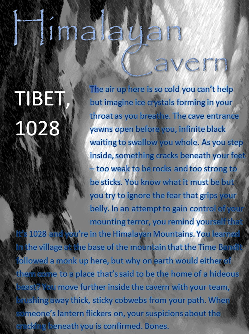 The air up here is so cold you can’t help but imagine ice crystals forming in your throat as you breathe. The cave entrance yawns open before you, infinite black waiting to swallow you whole. As you step inside, something cracks beneath your feet–too weak to be rocks and too strong to be sticks. You know what it must be but you try to ignore the fear that grips your belly. In an attempt to gain control of your mounting terror, you remind yourself that it’s 1028 and you’re in the Himalayan Mountains. You learned in the village at the base of the mountain that the Time Bandit followed a monk up here, but why on earth would either of them come to a place that’s said to be the home of a hideous beast? You move further inside the cavern with your team, brushing away thick, sticky cobwebs from your path. When someone’s lantern flickers on, your suspicions about the cracking beneath you in confirmed. Bones.