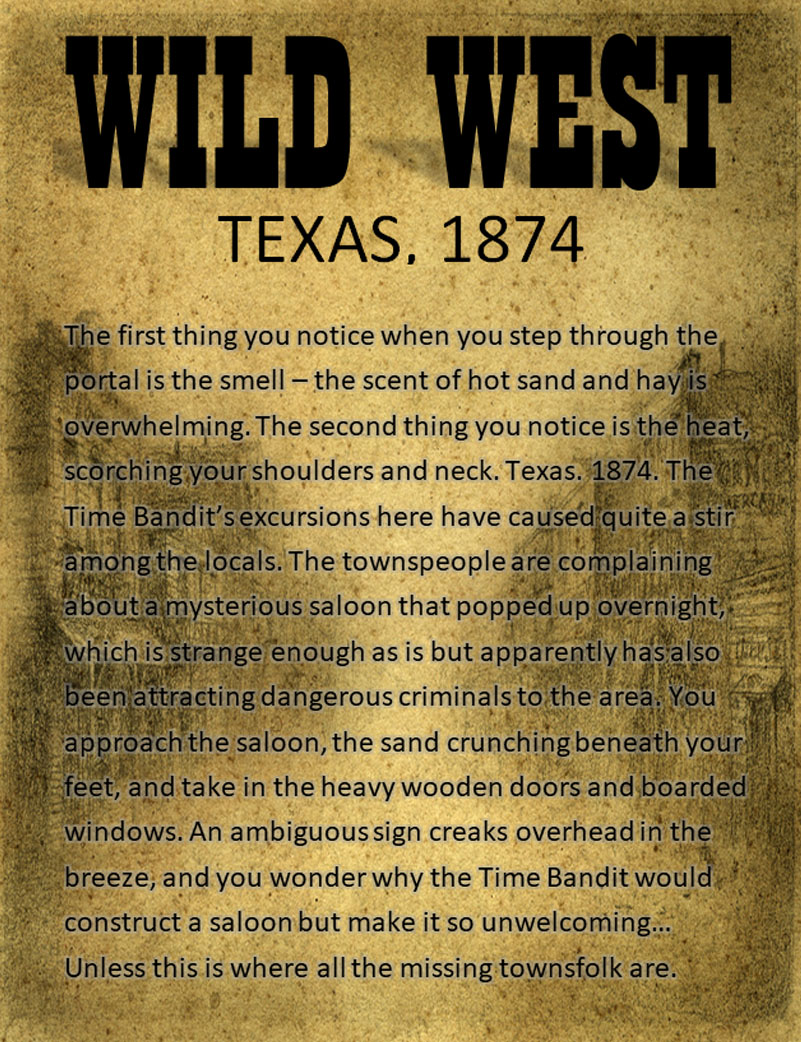 The first thing you notice when you step through the portal is the smell–the scent of hot sand and hay is overwhelming. The second thing you notice is the heat, scorching your shoulders and neck. Texas. 1874. The Time Bandit’s excursions here have caused quite a stir among the locals. The townspeople are complaining about a mysterious saloon that popped up overnight, which is strange enough as is, but apparently has also been attracting dangerous criminals to the area. You approach the saloon, the sand crunching beneath your feet, and take in the heavy wooden doors and boarded windows. An ambiguous sign creaks overhead in the breeze, and you wonder why the Time Bandit would construct a saloon but make it so unwelcoming… Unless this is where all the missing townsfolk are.